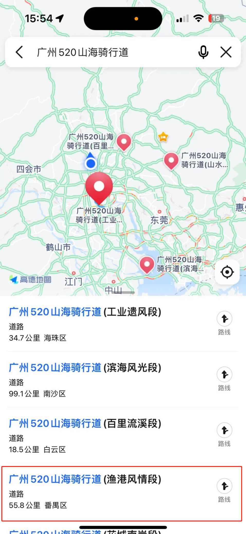 日前市规划和自然资源局已联合高德地图、百度地图率先上线已建成的8条共240公里的山海骑行道线路,市民可在高德地图中搜索关键词“广州520山海骑行道”,百度地图“骑行路书”板块下查询“山海骑行”,获得山水画卷段、增江画廊段、文化交织段等不同骑行游玩线路推荐。